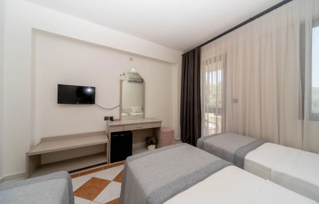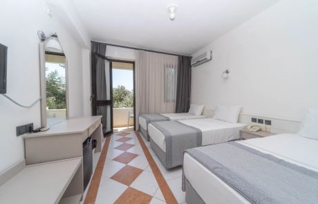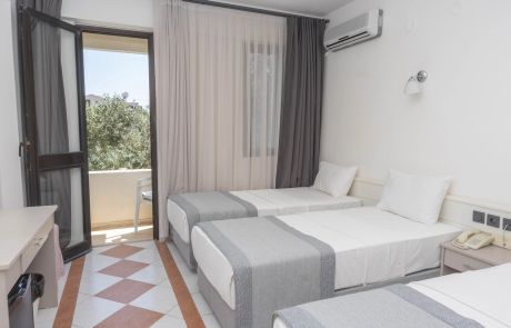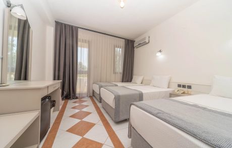 Üç kişilik ekonomik odalarımız Kahvaltı Avlusu katında bulunmaktadır. Lobinin bir alt katında olan odalarımız, kahvaltı avlusuna, çocuk oyun alanına ve çocuk havuzuna düz ayaktır. Tüm odalarımız balkonlu olup odaya herhangi bir yatak ilavesi yapılamamaktadır. Yataklar birleştirilebilmektedir.